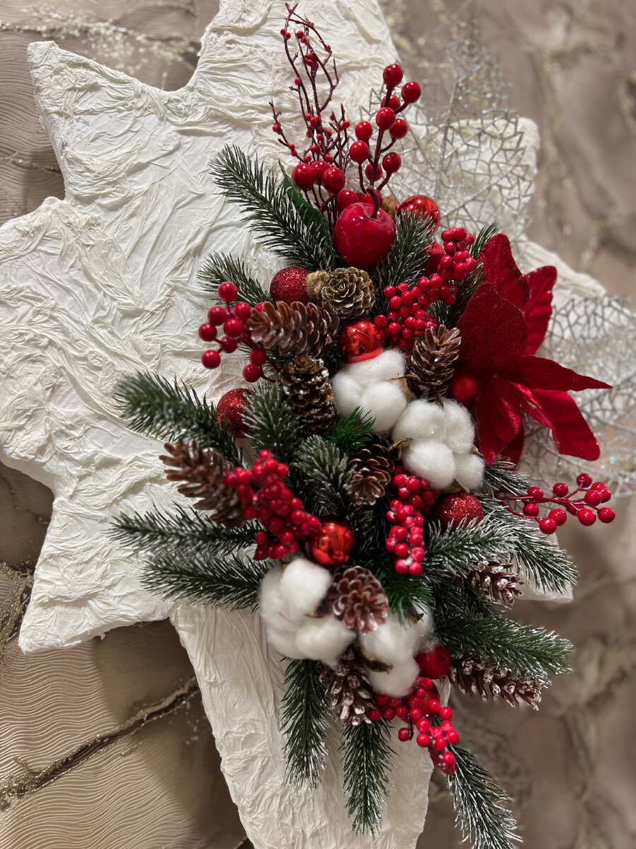 Для создания новогодней рождественской звезды вам понадобятся следующие материалы: Поэтапное описание процесса создания новогодней рождественской звезды: Шаг 1: Подготовка материала Разметьте на пенопласте большую звезду с помощью карандаша или маркера. Вы можете использовать шаблон или нарисовать звезду свободной рукой. С помощью острого ножа или ножовки аккуратно вырежьте звезду из пенопласта. Будьте осторожны, чтобы не поцарапать руки. Обязательно необходимо срезать маркер Шаг 2: Формирование текстуры В отдельной емкости смешайте в пропорции 0,5:1:0,5 Промакивайте бумажные салфетки в полученной смеси и приклеивайте на вырезанную из пенопласта звезду, формирую текстуру в хаотичном порядке. (См. ниже) Оставляем до полного высыхания Шаг 3: Украшение звезды Придайте звезде желаемый вид, используя различные украшения. Наклейте блестки, прикрепите бусины или прикрепите ленты к краям звезды. Дайте свободу вашей фантазии и придайте звезде яркий и праздничный вид. Поздравляю! Ваш