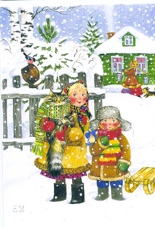 Этой темой я вдохновилась, рассматривая открытки художника-иллюстратора Елены Уваровой. Такая у нее зима теплая, с мягким пушистым снегом, с милыми добрыми лицами, яркими красками - как будто художница мое детство рисовала. И такое ощущение от ее открыток не только у меня. "Ничего нового в моих сюжетах нет, - призналась в одном из интервью художница, - надо только помнить свое детство, любить и понимать животных, ждать Новый год и дни рождения... Я всегда говорю, не надо искать реализма в моих картинах, но столько людей видит в них свое детство, отражение своего взгляда на мир, что это для меня самый приятный результат моего творчества, значит я не одинока, значит я такая как все, это радостно, грустно то, что сюжетов так много, что мне не хватит жизни их все нарисовать." (Из интервью с Еленой Уваровой на портале "А у вас?") А еще показать настоящую снежную зиму, отраженную художниками на открытках, поводом стал сегодняшний день - Михайлов день. По народным поверьям, по погоде в этот д