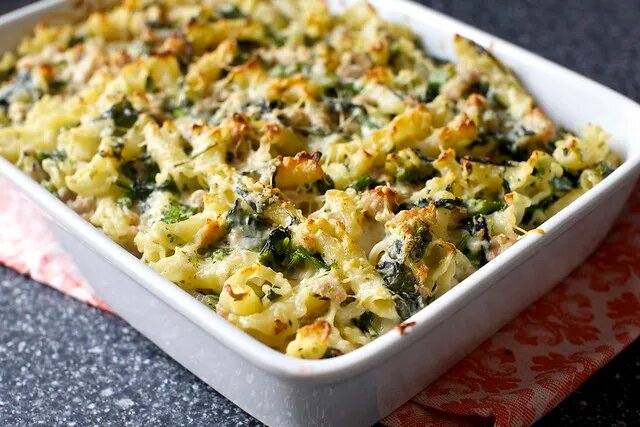 Этот рецепт будет согревать вас. Сытный и питательный ужин будет радовать вашу семью и гостей. Ингредиенты: Приготовление: 1. Доведите до кипения большую кастрюлю с хорошо подсоленной водой. Добавьте макароны и за 5 минут до приготовления добавьте нарезанный брокколи. Немного помешивая готовьте брокколи до состояния рабе вместе с макаронами. Слейте воду и переложите брокколи и макароны в большую тарелку. 2. Нагрейте 1-2 столовые ложки оливкового масла в большой кастрюле на среднем огне. Когда масло нагреется, добавьте колбаски или сардельки, разбивая ее деревянной ложкой, и готовьте, пока она не подрумянится, примерно 5 минут. Удалите со сковородки оставшийся жир лопаткой. 3. Бешамель: Растопите сливочное масло в той же кастрюле на среднем огне. Когда оно расплавится, добавьте муку и перемешивайте ее с маслом до получения однородной массы. Готовьте смесь еще 1 минуту, постоянно помешивая. Влейте немного молока, постоянно помешивая, до получения однородной массы. Продолжайте влива