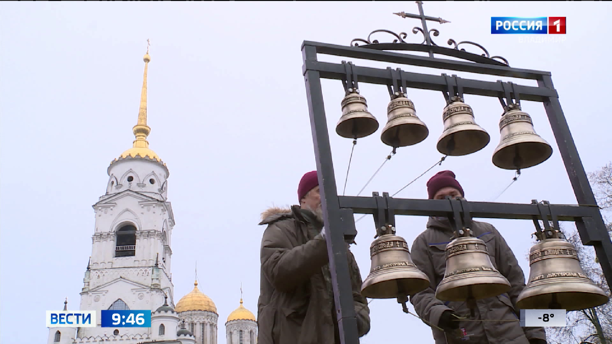 Недавно во Владимире побывала мобильная передвижная звонница московского звонаря Ильи Дроздихина. Мы заинтересовались, а что можно исполнить на такой звоннице, в чем ее возможности и преимущества? Все это выяснила Ангелина Свищ. Первые 40 ударов- сакральные, рассказывает звонарь Вячеслав Перфилов. В них - история одного из самых известных сюжетов в Ветхом Завете. Спасения пророком Моисеем еврейского народа от египетского ига. Путь его лежал через пустыню, где евреи бродили 40 лет прежде чем попасть на святую землю. Именно столько лет понадобилось народу , чтобы очиститься. Вячеслав Перфилов, старший звонарь колокольной мастерской Ильи Дроздихина: - Оказывается для того, чтобы люди которые прошли через какие-то серьезные катаклизмы, тем более через рабство. Произошло очищение, прошли несколько поколений, но поколений которые действительно единая цель - к Богу. Звонарным делом Вячеслав Перфилов занимается полжизни. Его инструмент - малая передвижная звонница. На ней изображения дореволюц
