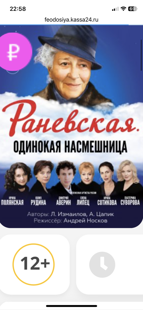 Нашу крымскую столицу посетил с гастролями Московский театр. И мной была принято решение посетить сие мероприятие! Сомневалась, стоит ли идти-отзывы в интернете были между: 3 часа сплошного восторга и Что за примитивный Аншлаг . Боялась что будет смотреться как цитатник Раневской либо сделают карикатуру на Фрекен Бок . Но все - таки решилась. Как послушная девочка- фото и видео съемку не вела, сохранила фото из интернета. В итоге осталась в восторге от игры Елены Липец-как она держала зал. Получила все качели эмоций - смех, слезы, мурашки. Три часа пролетели!!! Википедия подкинула мне неизвестные ранее факты, что Фаина Георгиевна увековечена в моем родном Симферополе: -В августе 2016 года мемориальную доску в честь актрисы установили на доме № 16 по улице Самокиша -Решением Симферопольского городского совета от 18.12.2020 г. № 264 именем Фаины Раневской названа одна из улиц района Петровские высоты Симферополя.
