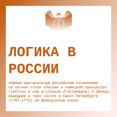 первым оригинальным российским сочинением по логике стали «Письма к немецкой принцессе» (Lettres à une princesse d'Allemagne) Л.Эйлера, сначала вышедшие в трех частях в Санкт-Петербурге (1767–72) на французском языке, затем в Лейпциге (1770) и позднее переведенные на русский под названием «Письма о разных физических и философических материях» (СПб., 1796).