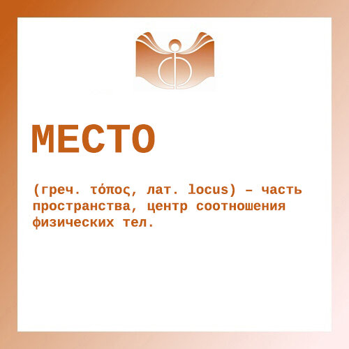 (греч. τόπος, лат. locus) – часть пространства, центр соотношения физических тел. В античной философии понятие места было выдвинуто Аристотелем в противовес трактовке Платоном пространства (Χῶρα) как вместилища тел и интеллигибельной материи, что позволяло дать онтологическое обоснование геометрии и геометрически правильных тел (Tim., 52a–53d). У Аристотеля пространство представляет собой «индивидуальное достояние» чувственно-воспринимаемых (физических) тел, т.е. место (Phys., 209 а30). Его подход к определению пространства-места связан с учением о первой сущности-субстанции, которая есть то, что обладает самостоятельным существованием (Мет., 1029 а, 1092 а17). В противовес геометрическому пространству Платона Аристотель настаивает на осязательно-физической трактовке пространства-места, которое позволяет понять движение как изменение места (Phys., 211 а12 – 211 b30). Место – граница движущегося, а для всех движущихся тел – абсолютная граница. В космологии Аристотеля в соответствии с п