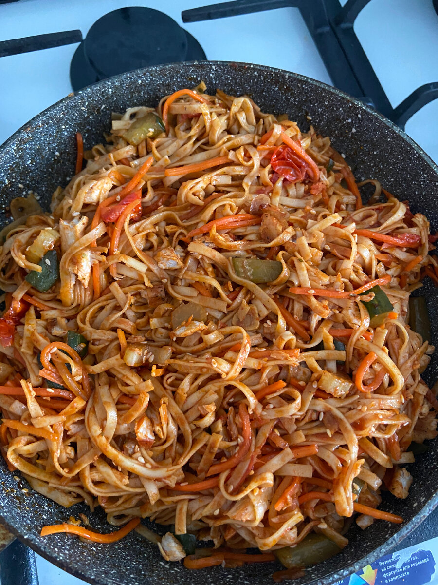 Здравствуйте, мои любимые читатели! Сегодня я хочу поделиться с вами моим рецептом наивкуснейшей лапши на сковороде🤗 Все очень просто! Ингредиенты : Подготовьте все продукты. Овощи вымыть. Чеснок почистить. Курицу я мариную так: Нарезаю слайсами примено одинаковой толщины, добавляю 1 столовую ложку растительного масла, специи:для гриля, паприка копченая, черный молотый перец, и 1 чайную ложку уксуса. Оставляем мариноваться минут на 10. Курицу поджариваем либо на сковороде, либо на гриле. Я готовлю вторым вариантом до хрустящей корочки. Далее нарезаем наши овощи. Лапшу отвариваем согласно инструкции на упаковке. Я дополнительно ломаю лапшу пополам. Варим в подсоленной воде 3 минуты. Затем обжариваем на растительном масле чеснок и сельдерей 2 минуты. После высыпаем остальные овощи, вливаем наш соевый соус, добавляя специи по вкусу. Перемешиваем и обжариваем еще 2 минуты. Теперь добавим лапшу и томатную пасту к ней, перемешивая. Готовим 3 минуты. Нарезаем курочку кубиками. Добавляем ее