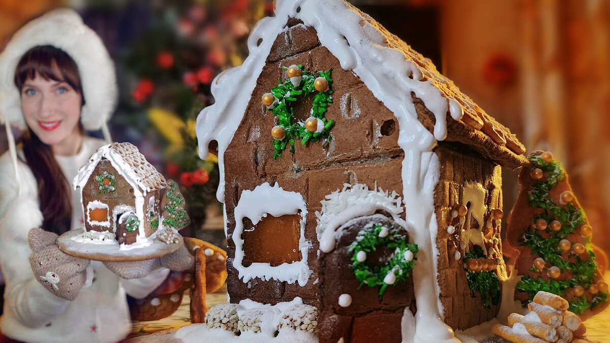Присоединяем элементы, чтобы они хорошо сцеплялись с глазурью. Декорируем крышу крендельками и добавляю эффект падающего снега из сахарной пудры.