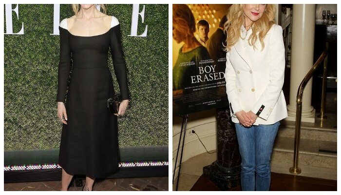Стройная длинноногая Николь Кидман шикарно смотрится в силуэтных миди платьях, которые подчеркивают ее безупречную фигуру. Силуэтное платье синего и базового черного цвета мировая знаменитость дополнила шикарными остроносыми туфлями и минималистичными аксессуарами.