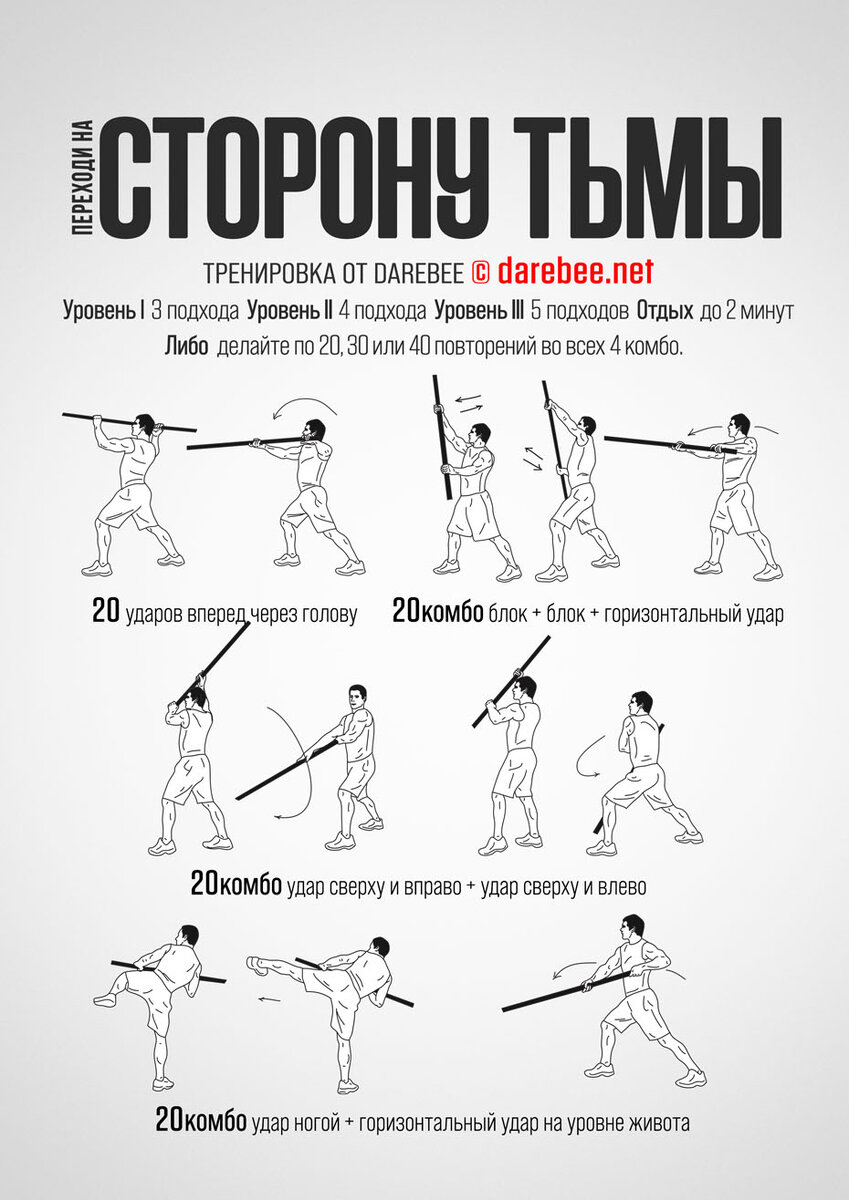 Новый релиз — Переходи на сторону Тьмы Дайте волю своей темной стороне и сражайтесь с высокоразвитым чувством точности. Тренировка с использованием посоха Бо. https://darebee.net/dark-side-workout.html ЦЕЛЬ: все тело ТИП: боевые искусства СЛОЖНОСТЬ: 3 — подходит для начинающих