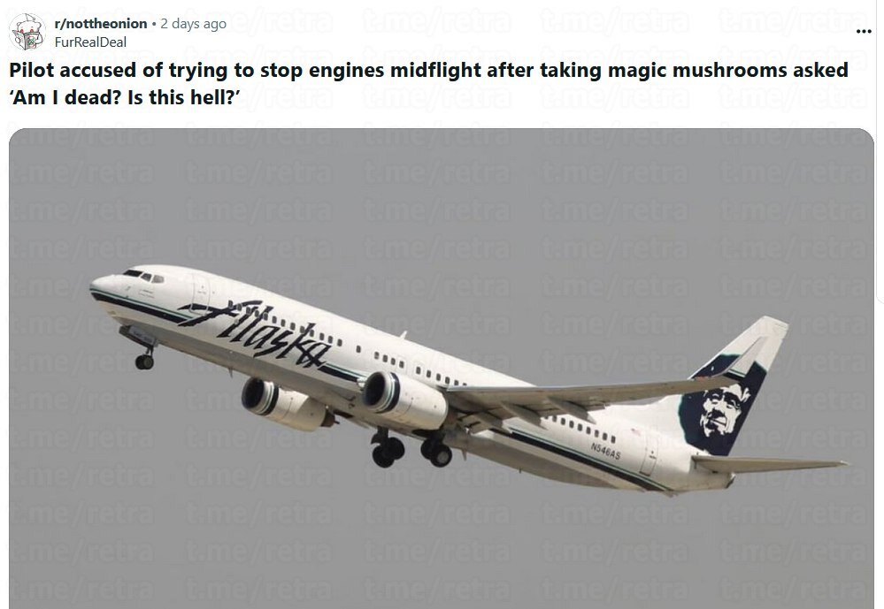 Пилот самолёта после употребления галлюциногенных грибов попытался заглушить двигатель во время полёта, т.к. подумал, что он умер и попал в ад. Пилоту Alaska Airlines предъявлены обвинения в покушении на убийство более чем 80 человек после того, как он якобы пытался выключить двигатели летевшего самолета. В интервью он рассказал, что незадолго до происшествия он употребил «волшебные грибы» и плохо спал. А во время полёта мужчине показалось, что он мёртв и находится в аду, поэтому решил остановить двигатели в попытке «вернуться обратно». Пилоту не дали этого сделать, после чего арестовали. Будьте здоровы и всегда с ответственностью относитесь к своей работе, особенно если вы отвечаете за жизни других людей.