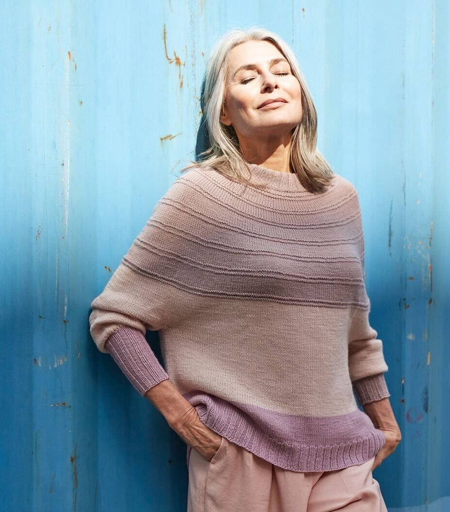 Работа над свитером начинается сверху. Двойная планка горловины переходит в кокетку, предварительно создав росток укороченными рядами. Кокетка выполнена несложным горизонтальным узором. При разделении на рукава и тело, детали вяжутся раздельно — петли рукавов отложены на вспомогательные спицы до завершения спинки и переда и вяжутся после их завершения. Линия низа спинки немного ниже переда благодаря вязанию укороченными рядами.