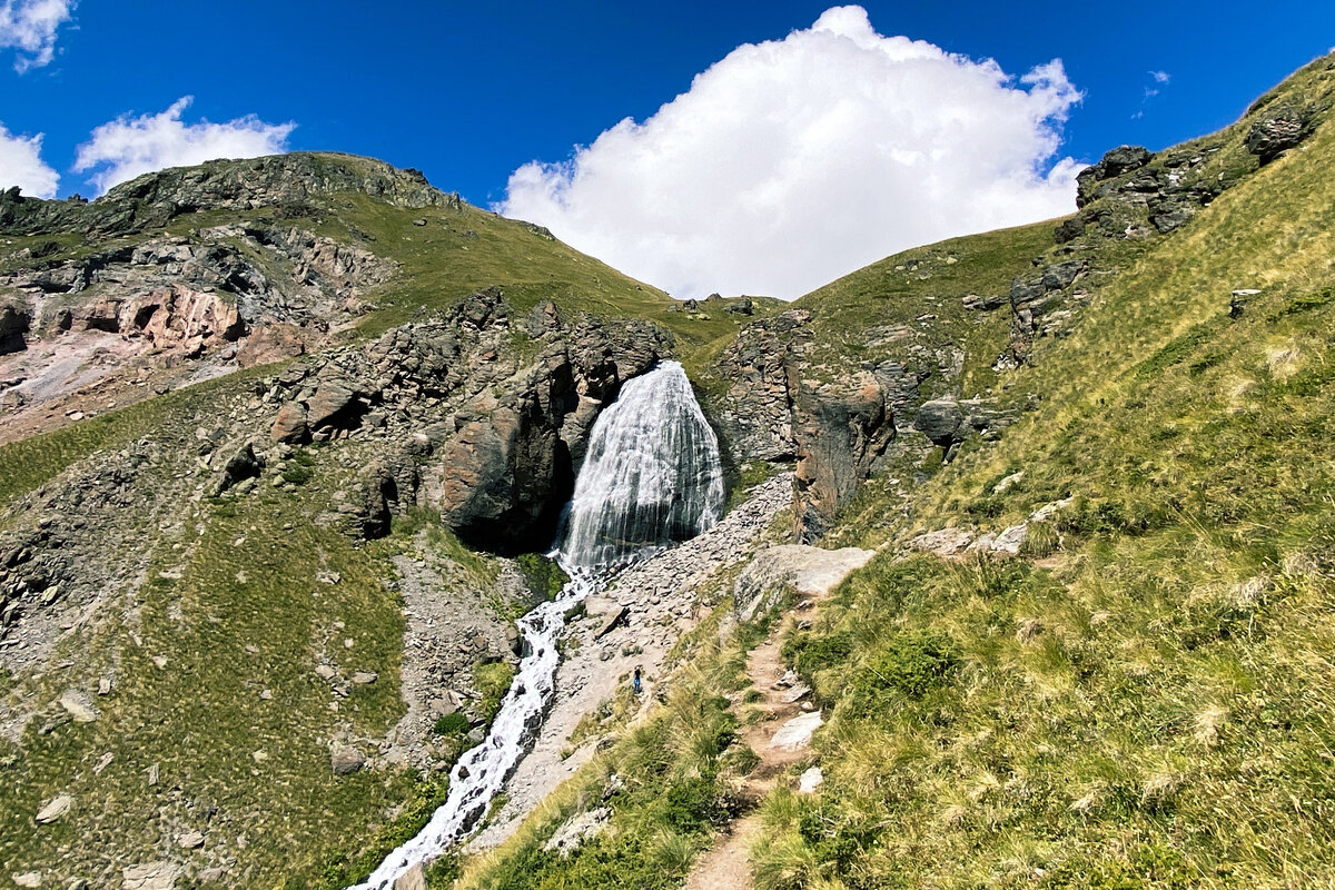 Водопад Девичьи Косы по другому ещё называется Чыранбаши Су. В поселке Терскол, откуда начинается маршрут вы не услышите такого названия, потому что даже местные его так не называют. Тропа стартует от мечети в центре поселка, вы проходите будочку национального парка и начинаете подниматься по серпантину. Тропа достаточно широкая и комфортная. По пути будет много смотровых точек на Кавказский хретет и соседние вершины. Высота водопада достигает 30 метров, а за его струями есть грот в который можно пройти сквозь воду. Советую попробовать.