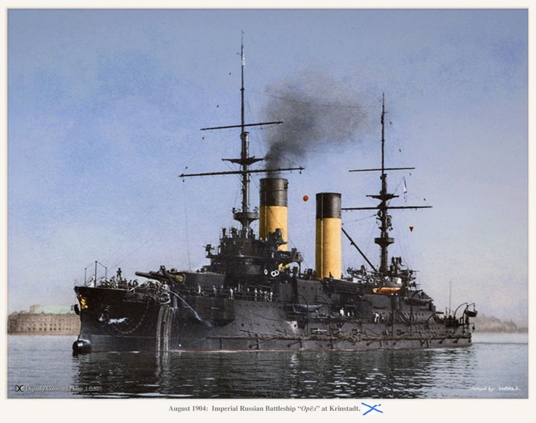 Традиционно корабли красили : черный корпус, желтые трубы. Причин для достаточно странной окраски кораблей Тихоокеанской эскадры было несколько. На цусимских форумах сломали много копий по поводу окраски кораблей русской эскадры: рассматривали и пристрелку, и маскировку в ночное время.
