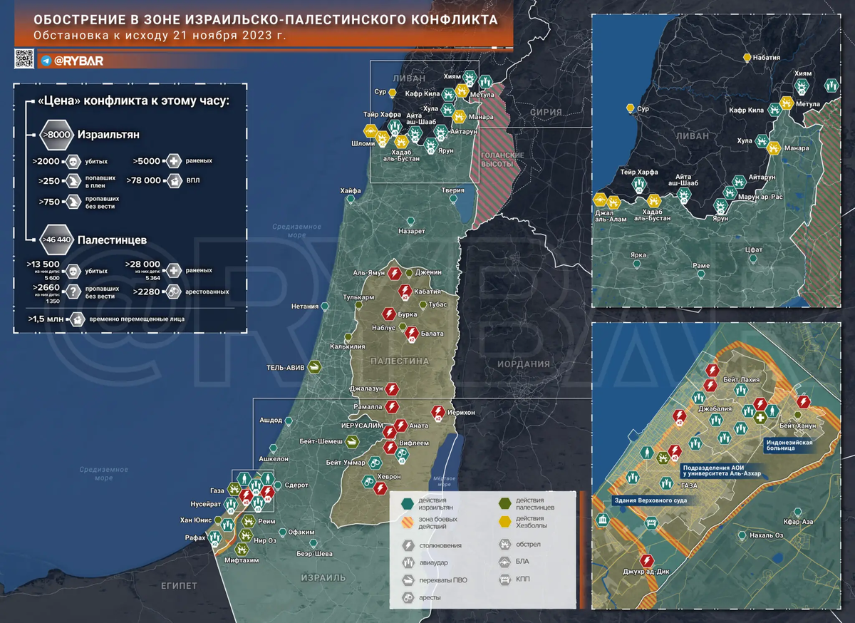 Израильские войска продолжают проводить наземную операцию в секторе Газа и пытаться продвинуться вглубь городской застройки как с севера, так и из прибрежной зоны. На текущий момент подразделения АОИ закрепляются в окрестностях индонезийской больницы – по данным местного минздрава, в учреждении до сих пор находятся более 2,5 тысяч человек, среди которых есть как раненые, так и беженцы. Сама больница остается без прямого электроснабжения, сотрудники медкомплекса используют растительное масло в качестве альтернативы топливу для работы электрогенераторов.
