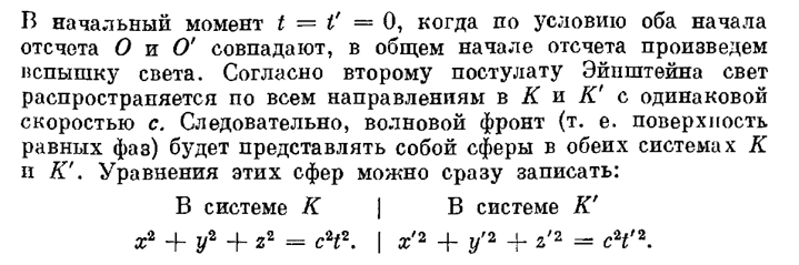 Специальная теория относительности или СТО – это логико-математический конструкт, предписывающий пространству одинаковую скорость света во всех инерциальных системах. Исходя из этой центральной идеи, в СТО придуманы различные математические выкладки, которые обобщены в концепцию четырехмерного пространства-времени. Три координаты (x,y,z) – это трехмерное физическое пространство, а четвертая координата ( t') – виртуальная ось времени, масштаб которого может изменяться в зависимости от скорости инерциальной системы. Однако, используя в качестве основы идею, выходящую за рамки обычной логики, весьма затруднительно обосновать ее обычными логическими рассуждениями. Это приводит к внутренним противоречиям и парадоксам в теории. Приведем один из примеров, когда логика СТО не срабатывает при попытке согласовать ее с физической реальностью. Итак, о чем говорится в приведенном фрагменте? Поскольку одна инерциальная система движется относительно другой, а скорость света в обеих инерциальных систе