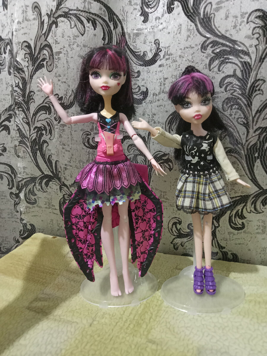 Часто на Авито, Юле, личных страничках продавцов рассматриваем различных куколок. Очень хочется настоящую, фирменную куклу, но цены иногда кусаются. Да и как разобрать на фото, кто производитель игрушки, если продавец не предоставил в объявлении подробных фото, а заявку оставить надо срочно? Вот, например, для сравнения две куколки - две Дракулауры, одна от фирмы Маттел, вторая китайская. Этих я специально выбрала из наличия, чтобы максимально точно продемонстрировать разницу. Хотя, чего греха таить, некоторые "ноу нейм" на взгляд почти неотличимы от оригинала. Разница лишь в отсутствии клейма. Но в момент написания поста Дракулауры у меня есть только такие. Вот вам ещё и Клодин Вульф - тоже занятный персонаж и тоже фирменная. Начнем сравнивать? Разумеется , первое, что бросается в глаза - это рост девчушек. Девочка с розовыми крыльями имеет классические 12 дюймов роста, пропорциональная и ладненькая. Та, что в платьице - пониже, имеет неестественно длинные ноги и коротенькое туловище.