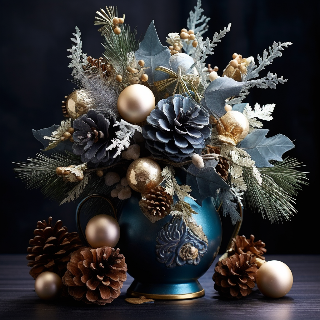 Этот роскошный новогодний букет из веток ели, шаров, цветов и шишек – идеальное украшение для праздничного стола или интерьера. Он создаст уютную и праздничную атмосферу, а его красота и оригинальность не оставят равнодушными ни одного гостя.