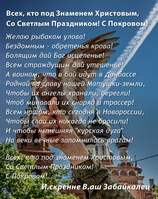 Желаю рыбакам улова! Бездомным - обретенья крова! Болящим дай Бог исцеленье! Всем страждущим дай утешенье! А воинам, что в бой идут в Донбассе Родной во славу нашей Матушки-земли, Чтобы их ангелы хранили, берегли! Чтоб миновали их снаряд и трассер! Всем нашим, кто сегодня в Новороссии, Чтобы свои их никогда не бросили! И чтобы нынешняя "курская дуга" На веки вечные запомнилась врагам! Всех, кто под Знаменем Христовым, Со Светлым Праздником! С Покровом! С Праздником, братья и сестры🙏 *** В час тяжких испытаний мы на Бога уповаем! О нас ему замолвит слово Святый Отче Николае! Господь всегда во всём поможет Православным людям! Молить Его о нас угодник Николае будет! С Праздником, братья и сестры 🙏 *** И даже в самый трудный час нам самый злой и лютый враг не страшен! Нас дома ждут с Победой наши Верочки, Надюши и Любаши 🙏 *** С праздником Святых мучениц Веры, Надежды, Любови и матери их Софии 🌹 С Праздником всех именинниц 🌹 30.09.24 *** Вдогонку к: "Январь, ребятки, с