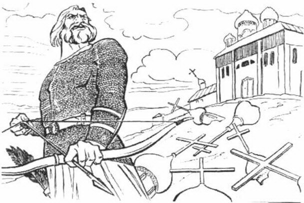 Как мы видим, русский богатырь не просто негативно относится к христианству – он буквально идёт на него войной. Но храмы не рушит (они были и раньше), а удаляет лишь маковки (то есть навершие куполов, что “ошеломило” народ, “одурманило”, недаром маком и дурманом называют один из наркотиков) и языки с колоколов (символ лживой речи). Символически обозначено и отрицательное отношение ко всему, что связано с христианством. Это видно и в обращении богатыря к Алёше Поповичу, оскорбившему гостей на пиру главного героя.