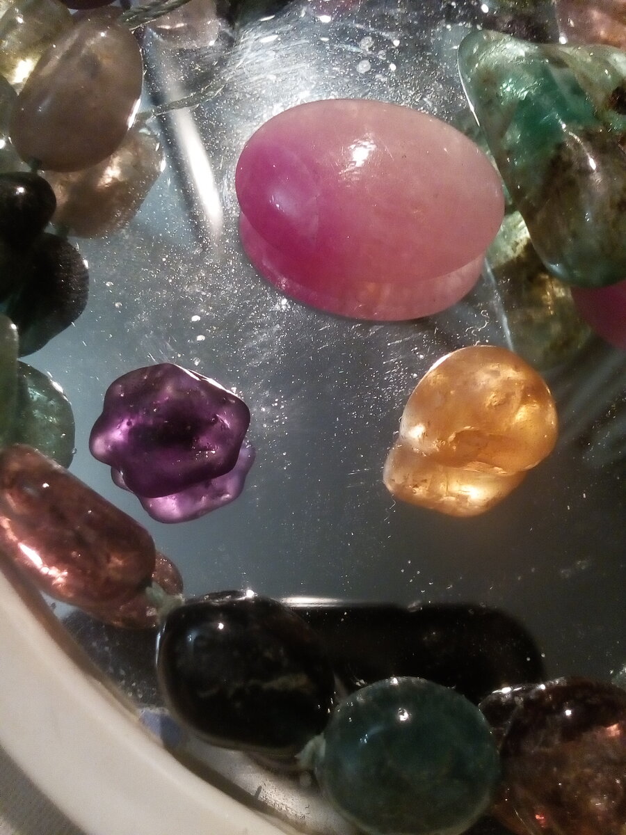 До Сокольников мне добираться не удобно, так что на Выставке камней я там был лишь однажды. Но камушки прикупил. И вот на фото они.... Желтый, фиолетовый, два розовых полихромных, зелёный и синий. Топаз, сапфир, сапфиры, изумруд и турмалин. Нитка турмалинов на фото для антуража...