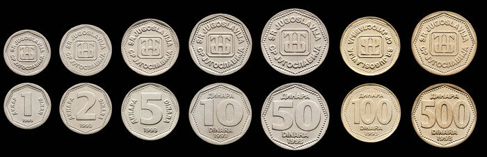 Сложный период распадающегося на части государства. Но не смотря на гиперинфляцию в оборот иногда выпускались и монетки. Характерная особенность дизайна монет с 1993 года - крупные и толстые цифры номинала, вместо государственной символики на аверсе изображалась эмблема Национального банка. Монеты 1, 2, 5, 10 и 50 динаров медь-цинк-никель. 100 и 500 динаров латунь. Самая крупная монета в 500 динаров хоть и чеканилась тиражем в 20 475 500, но в оборот не пошла, а почти сразу пошла на переплавку. 1994 Год, очередная смена денег. Особого изменения монеты не претерпевают, к монете в 1 динар добавляется "новый". 1 и 5 пара из латуни, остальные из сплава медь-никель-цинк. Пост автора high.castle. Читать комментарии на Пикабу.