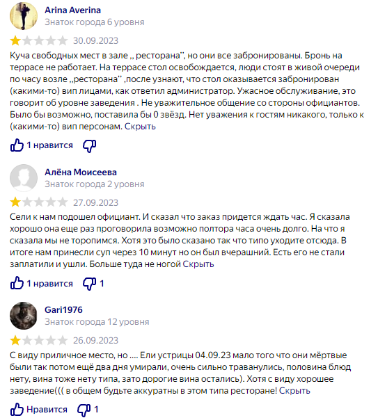 Негативные отзывы всегда пишутся в сердцах, поэтому выделю основные проблемы, о которых предупреждают гости: время ожидания, отсутствие свободных столов/столы под "бронью", претензии к поведению персонала, частные случаи с плохо приготовленными/испорченными блюдами. Негативных отзывов у "Абрау" больше, чем обычно бывает у ресторанов с таким высоким рейтингом, однако и проходимость у него высокая. Сейчас декабрь, вроде бы и не сезон, а уже к 11 утра едут и едут бесконечные экскурсионки. А в них потенциальные гости =)