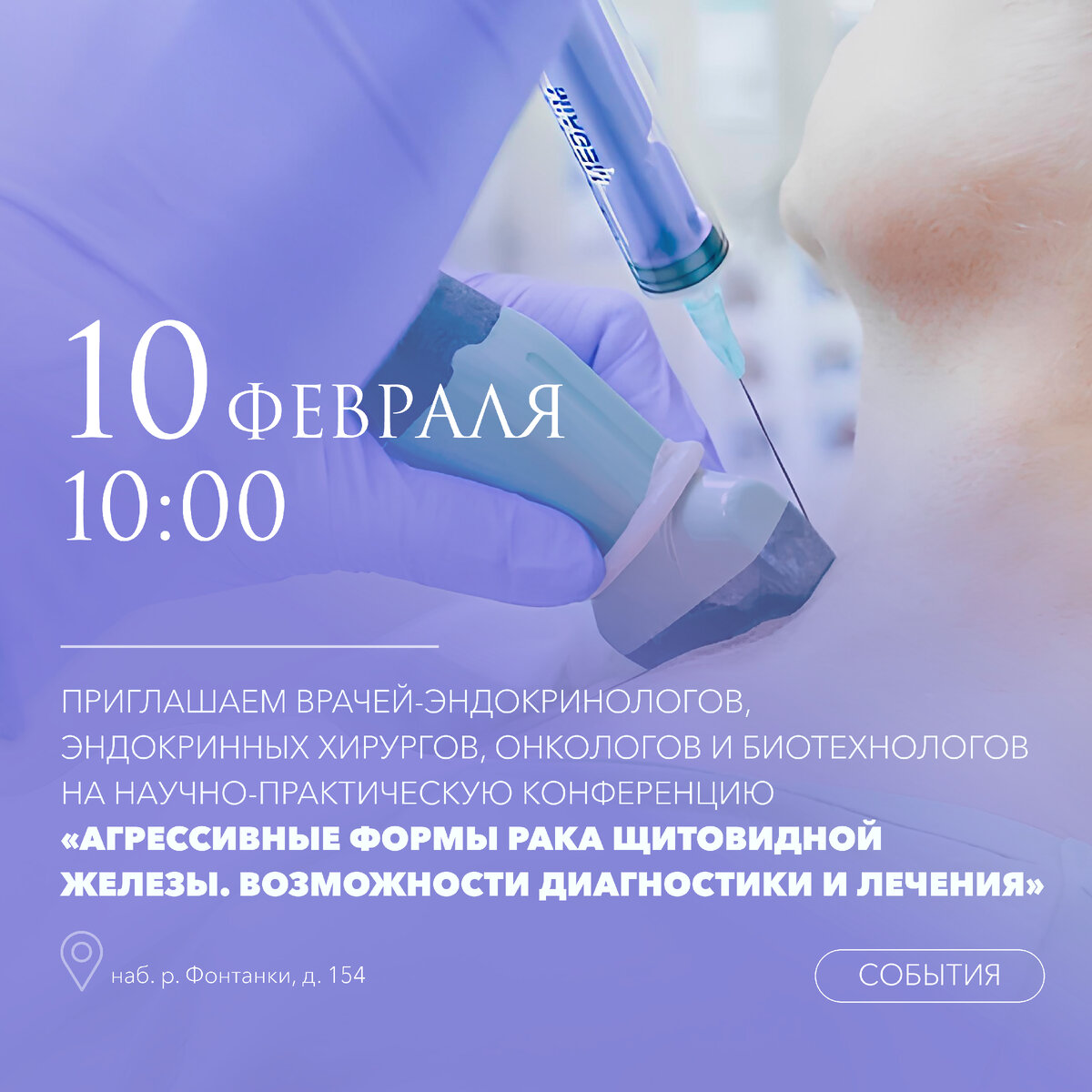 Приглашаем врачей-эндокринологов, эндокринных хирургов, онкологов и биотехнологов в лечебно-диагностический комплекс на Фонтанке на научно-практическую конференция «Агрессивные формы рака щитовидной железы. Возможности диагностики и лечения», которая состоится 10 февраля 2024 года.