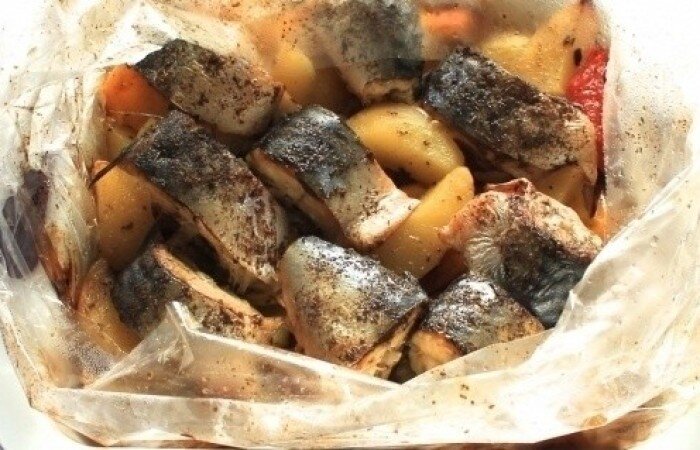 Ингредиенты: Свежий тунец-500гр., картофель 500-700гр., репчатый лук-150гр., зелень-по вкусу., майонез или сметана-по вкусу., соль, перец, специи-по вкус. Приготовление: Картофель почистить, помыть, нарезать кружочками толщиной примерно 8мм. Добавить лук, нарезанный полукольцами, измельчённый укроп, майонез. Посолить, поперчить и хорошо перемешать. Рыбу нарезать небольшими кусочками, посолить и поперчить. Картофель и рыбу выложить в рукав для запекания. Завязать, сделать в пакете несколько проколов. Запекать в разогретой до 200 градусов духовке 1 час. Подавать блюдо горячим. Приятного аппетита!