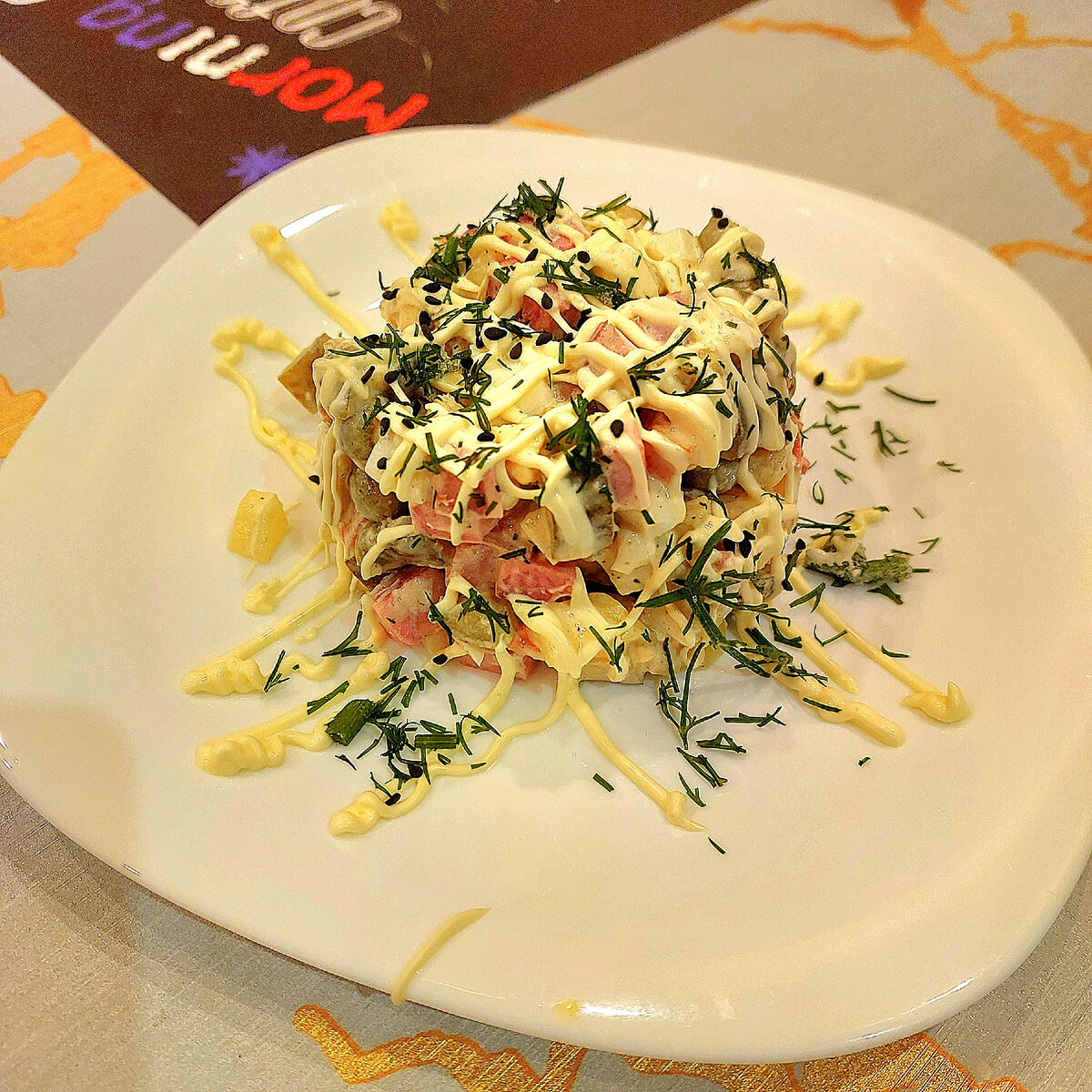 Оливьё — закусочный салат русской кухни из отварных корнеплодов, солёных огурцов, яиц с мясом или варёной колбасой с майонезной заправкой. Носит имя автора рецепта — французского шеф-повара ЛЮСЬЕНА ОЛИВЬЕ, которому принадлежал ресторан "Эрмитаж" в Москве. В России этот салат относится к французский кухне, в то время как за её пределами его воспринимают как блюдо русской кухни. Современный салат Оливье имеет мало общего с оригиналом. Точный рецепт салата не известен, так как Оливье был очень скрытным, известен лишь его примерный состав, который повар менял в зависимости от бюджета посетителей его ресторана, он считался фирменным блюдом "ЭРМИТАЖА". Сам Эрмитаж был шикарным рестораном, его здание до сих пор сохранилось, большинство посетителей были купцами, которые хорошо платили Оливье за его высокую кухню. Это был даже не салат, а именно блюдо, в котором нарезанные ломтиками яйца играли исключительно эстетическую роль, а картофель выкладывался горкой в центре блюда.