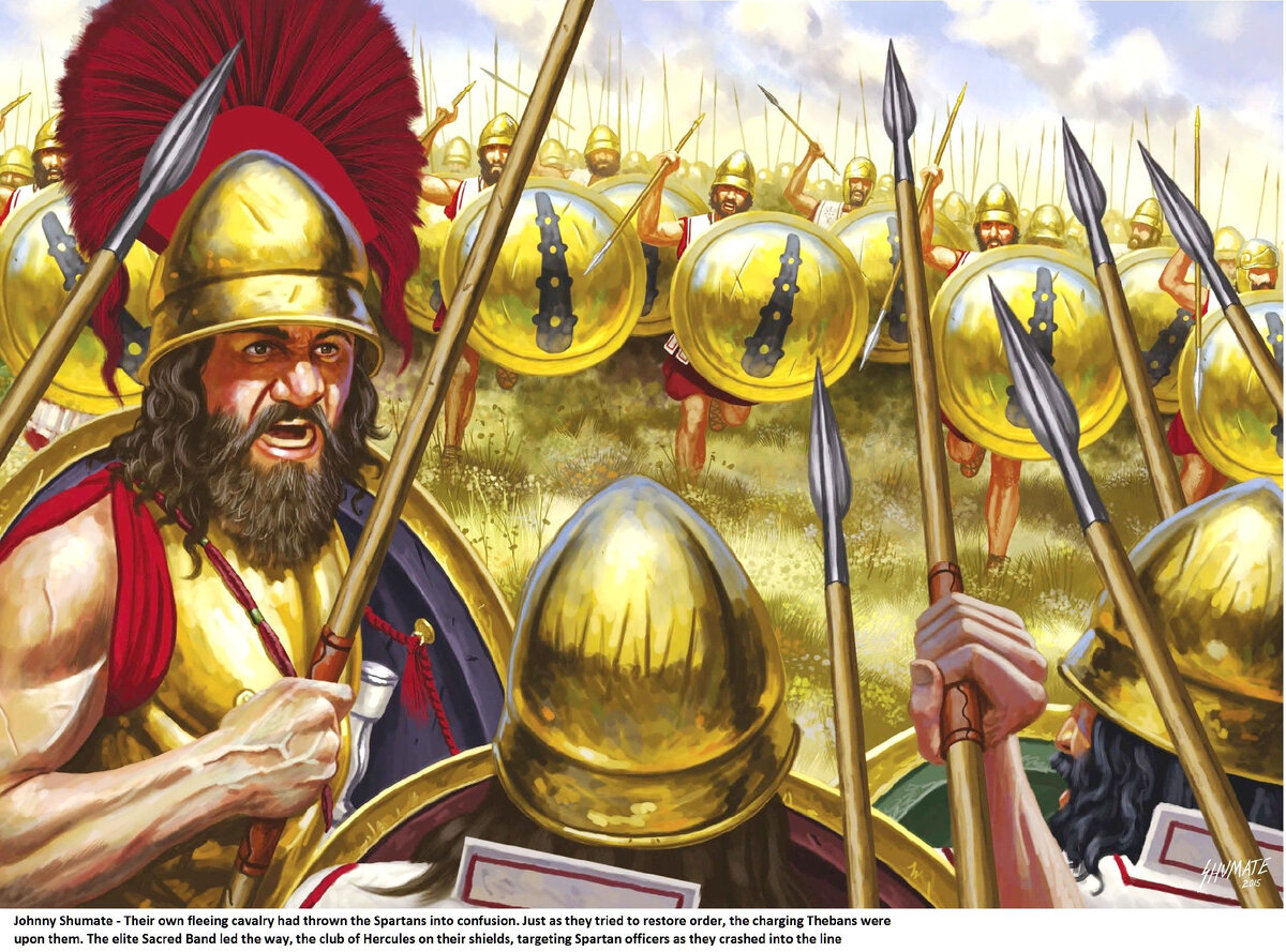 Я обратил внимание на то, что летописцы, описывая ход сражения при Левктрах, утверждают, что фиванский Священный отряд в буквальном смысле слова «продавил» боевое построение спартанцев на узком участке фронта. По Ксенофонту: «Как только Клеомброт повел войско в атаку, произошла кавалерийская дуэль и через самое короткое время лакедемонская конница была разбита. При отступлении она врезалась в ряды своих же гоплитов, а вслед за ними налетела и фиванская пехота. После того как были сражены сам полемах Динон, царский сотрапезник Сфодрий с сыном Клеонимом, войско не выдержав НАТИСКА МАССЫ (здесь и далее выделено мною) врагов, стало отступать». То есть, по Ксенофонту монолитные ряды спартанской фаланги были смяты своей конницей, и боевая линия лакедемонян на определенном участке фронта пришла в полное расстройство, чем незамедлительно воспользовался Эпаминонд. По Диодору: «Массивная колонна, возглавляемая Эпаминондом, всей тяжестью НАДАВИЛА на лакедемонян и ПРОГНУЛА линию противника. Ряды лакедемонян были ОТТЕСНЕНЫ…».