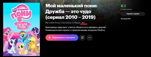 Мультсериал про пони My little pony получил рейтинг 18+ на стриминговом сервисе «Кинопоиск». Производитель мороженого «Радуга» опроверг пропаганду ЛГБТ-движения Причиной введения таких ограничений мог стать персонаж Рэйнбоу Дэш, которая имеет радужную окраску, рассуждают пользователи в соцсетях. В пятницу, 1 декабря, в России ввели запрет на «Международное движение ЛГБТ» и признали его экстремистским. Радуга без голубого цвета считается одним из атрибутов движения. Ранее телеканал «ТНТ Music» подверг цензуре клип корейской группы Seventeen «God of Music», убрав из него радугу. Изображение заменили черно-серо-белыми тонами, сообщает Telegram-канал «Радиоточка НСН».