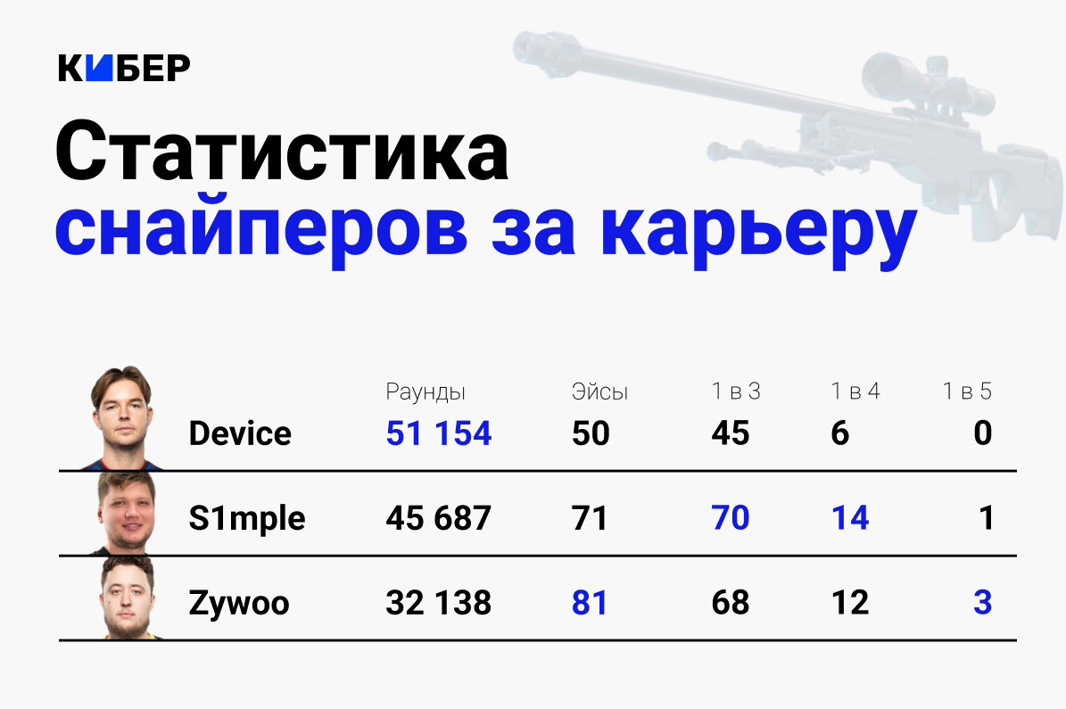И это, в общем то, почти все. Да, у Девайса было еще немало эйсов и хайлайтов, но по этому показателю он значительно уступает главным конкурентам в CS:GO – Зайву и Симплу. Если из сочных моментов француза и украинца уже можно монтировать полнометражные фильмы, то у датчанина все довольно печально. Даже среди приведенных роликов только один – с AWP. Неужели у топ-3 снайпера в истории Global Offensive и правда банально нет хайлайтов? Или мы что-то упускаем?