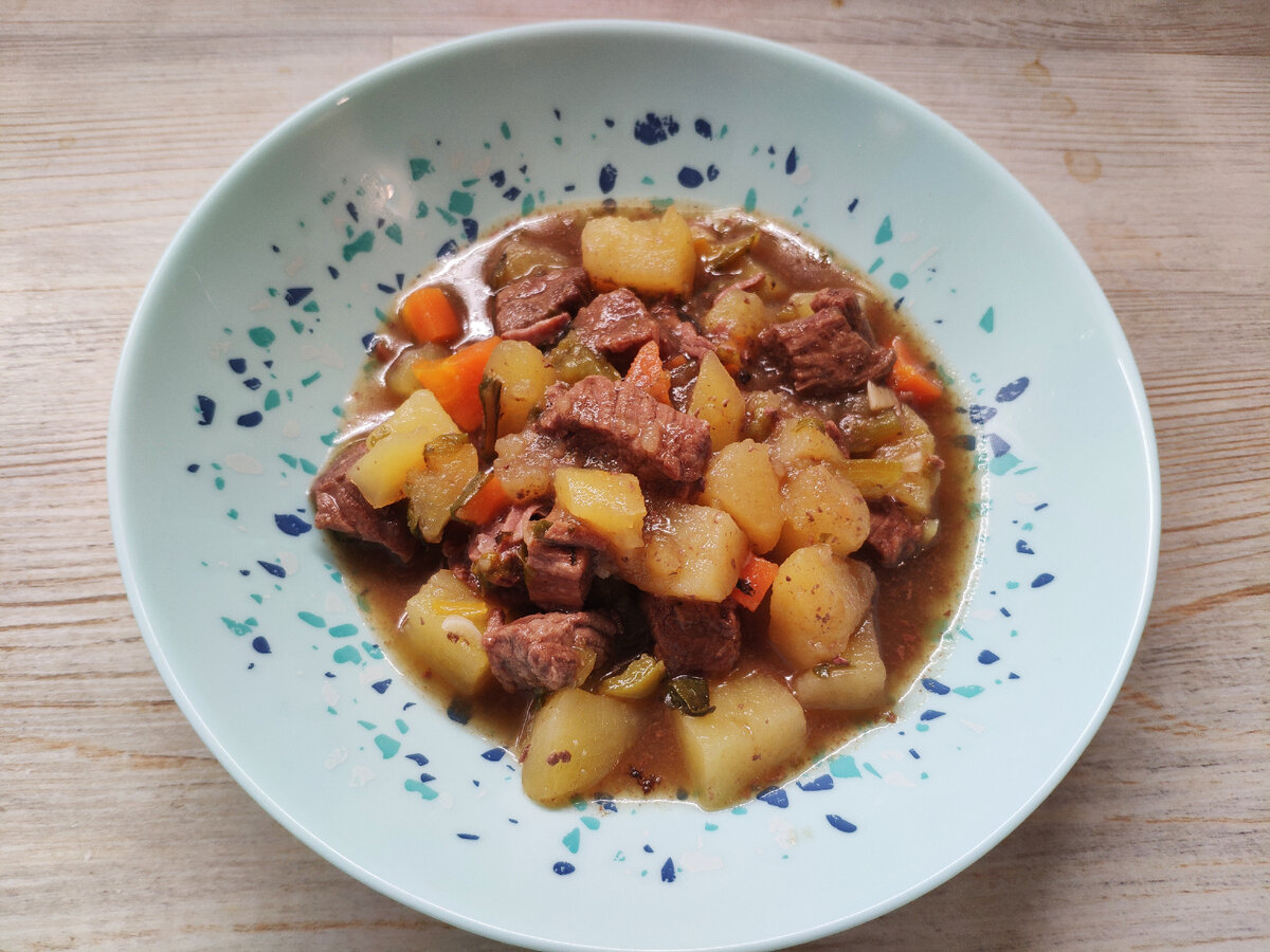 Говядина - 600-700гр. Сладкий перец - 2 шт. Морковь - 1шт. Лук - 1шт. Картофель - 4-5 шт. Чеснок - 4 зуб. Если хочется, можно добавить половину кабачка. Зелень - пучек (у меня петрушка и немного базилика). Томатная паста - 1 ч.л, если нет, то можно без нее. Вода - пол-литра. По вкусу: соль, перец. Мясо нарезаем. Мясо обжариваем доливаем воды и тушим почти до готовности. Я это делаю в мультиварке. Можно делать в сковородке. Чистим и нарезаем лук. Обжариваем его на сковородке до готовности. Можно без лука. Все овощи чистим. Режем кубиками. Добавляем к мясу овощи и воду. Тушим овощи и мясо 20 минут. Подписывайтесь на канал. Это не просто рецепты. а любимые и простые рецепты из моей поваренной книги, которые всегда получаются. Затем добавляем томатную пасту, соль, перец, любимые специи и зелень. Тушим еще 7 минут. Теперь пробуем. Если нужно досаливаем. Приятного аппетита!