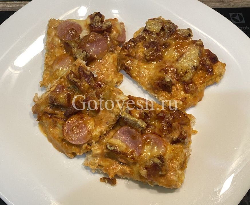 Вкусная пицца для желающих похудеть, которая не добавит вам лишних килограммов. Ингредиенты: - куриный фарш – 500 граммов - яйцо -1 штука - мука – 2 столовые ложки -майонез – 3 столовые ложки - кетчуп – 1,5 столовые ложки - соль – 0,5 чайной ложки, - приправы по вкусу, - колбаса, сосиски – 200 граммов - сыр – 300 граммов Способ приготовления: 1. Сначала приготовить «тесто». В миске смешать куриный фарш, 1 яйцо, добавить соль, специи, 2 столовые ложки майонеза и 2 столовые ложки муки. 2. Противень застелить пергаментом, выложить на него "тесто" ложкой, равномерно распределить. 3.Поставить противень в разогретую до 180 градусов духовку на 10 минут. В это время приготовить соус: смешать в пиале кетчуп и майонез- Кетчунез готов! 4. Колбасу и сосиски нарезать небольшими кубиками. 5.Сыр натереть на крупной терке. 6. Достать противень из духовки, выложить на него соус, сосиски, колбасу, посыпать сыром. 7. Поставить в духовку на 20 минут. Пицца готова! Приятного аппетита! Удивляйте гос