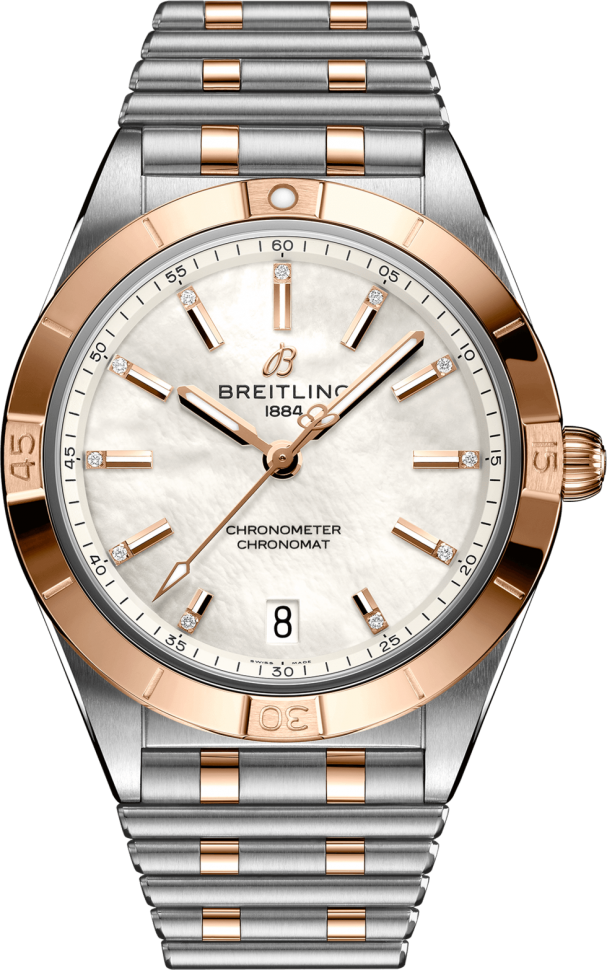 Breitling Chronomat Automatic 36 U10380101A2U1, которые можно купить в нашем интернет-магазине SwissChrono.ru, — дайверские часы с водонепроницаемостью 100 м в двухцветном 36 мм корпусе толщиной 10 мм из 18-каратного розового золота и нержавеющей стали на браслете Rouleaux. Часы имеют характерный для Breitling спортивный силуэт с куполообразной заводной головкой и вращающимся в одном направлении безелем со шкалой времени погружения и характерными метками-райдерами. Белый циферблат с бриллиантовыми индексами, накладными люминесцентными стрелками и метками с покрытием Super-LumiNova, окошком даты в позиции «6 часов» защищен выпуклым антибликовым сапфировым стеклом. Модель основана на автоматическом механизме калибра Breitling Caliber 10, сертифицированным COSC (база ETA 2892), с запасом хода около 42 часа.