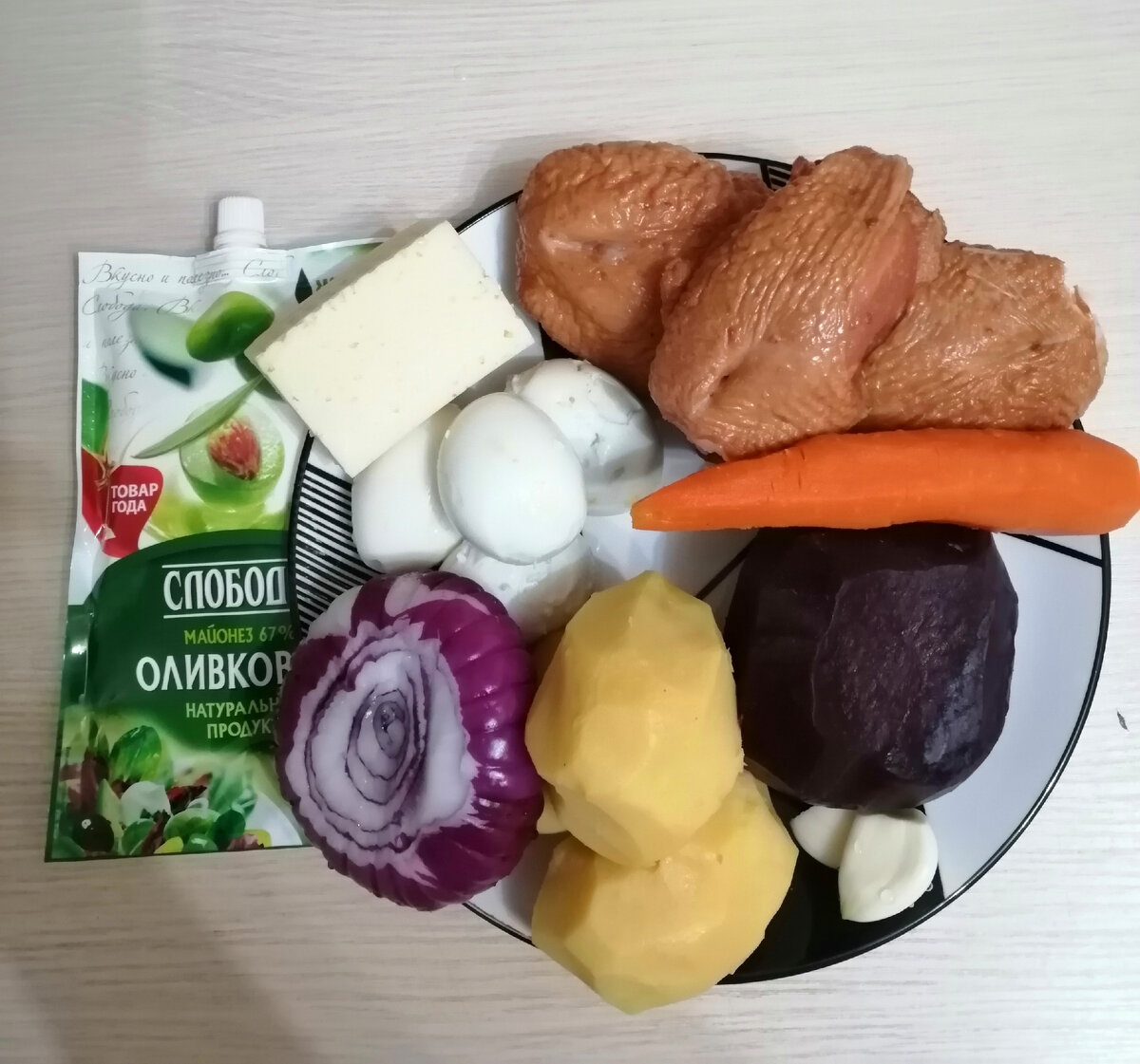 Всем привет! Сегодня хочу поделиться рецептом ещё одного салата, который может занять достойное место на вашем праздничном столе. Нам понадобится копчёная курица 300 гр, две свёклы или одна крупная, как у меня, одна морковь, две средних картофелины, 3 яйца, небольшой кусочек твёрдого сыра, примерно 70 гр, один зубчик чеснока и майонез для заправки. Ещё понадобится одна луковица. Лук можно предварительно замариновать, я этого делать не буду, просто возьму салатную луковицу. Салат будем готовить слоями, поэтому понадобится плоская тарелка. Для начала приготовим мясо. У меня сегодня куриные бёдра. Очищаем их от кожи и костей. Нарезаем мясо мелким кубиком, выкладываем на тарелку и смазываем майонезом. Все остальные ингредиенты мы будем натирать на крупной тёрке. За мясом у нас идёт слой натёртого картофеля, который немного присаливаем и смазываем майонезом. Следующим слоем выкладываем лук, нарезанный кубиком и морковь, также промазываем майонезом. Дальше выкладываем натёртые яйца и