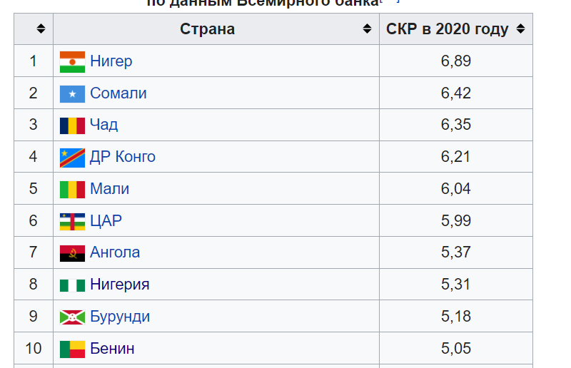 Давайте посмотрим на список стран, который дает Википедия. Ее сложно заподозрить в просмотре ток-шоу Соловьева. Это по суммарному коэффициенту рождаемости. Первые десять стран.