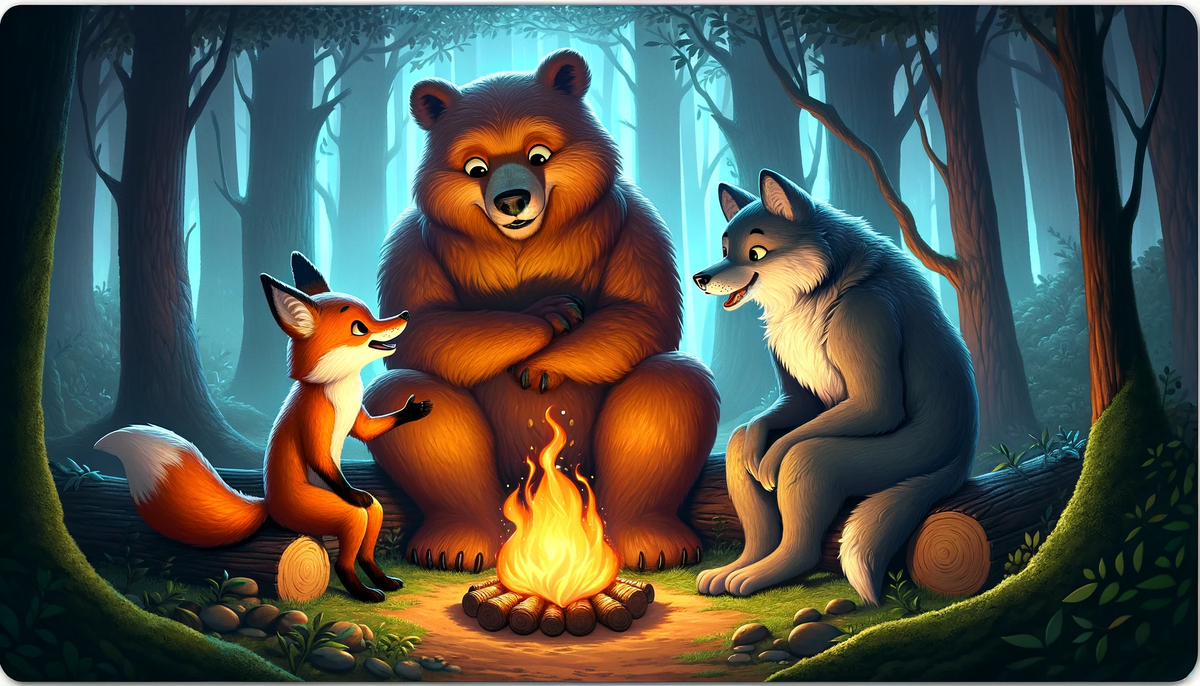 As night fell, it was time to find shelter. The Generous saw an abandoned mill, lay in a grain trough, and fell asleep. He was woken by a strange noise. Awakening, he saw a fire burning nearby, with a fox, a wolf, and a bear sitting around it. The Generous was terrified and lay still.
