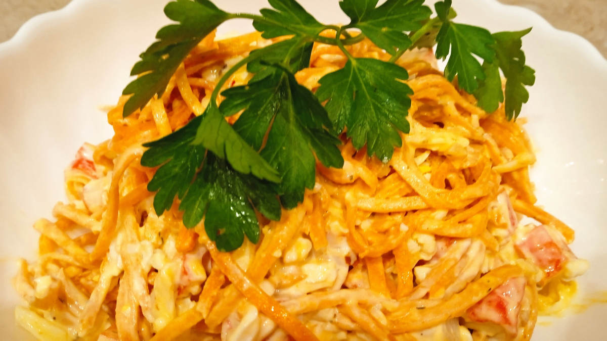 Салат из корейской морковки, крабовых палочек и яиц. Очень быстро, а главное вкусно!
