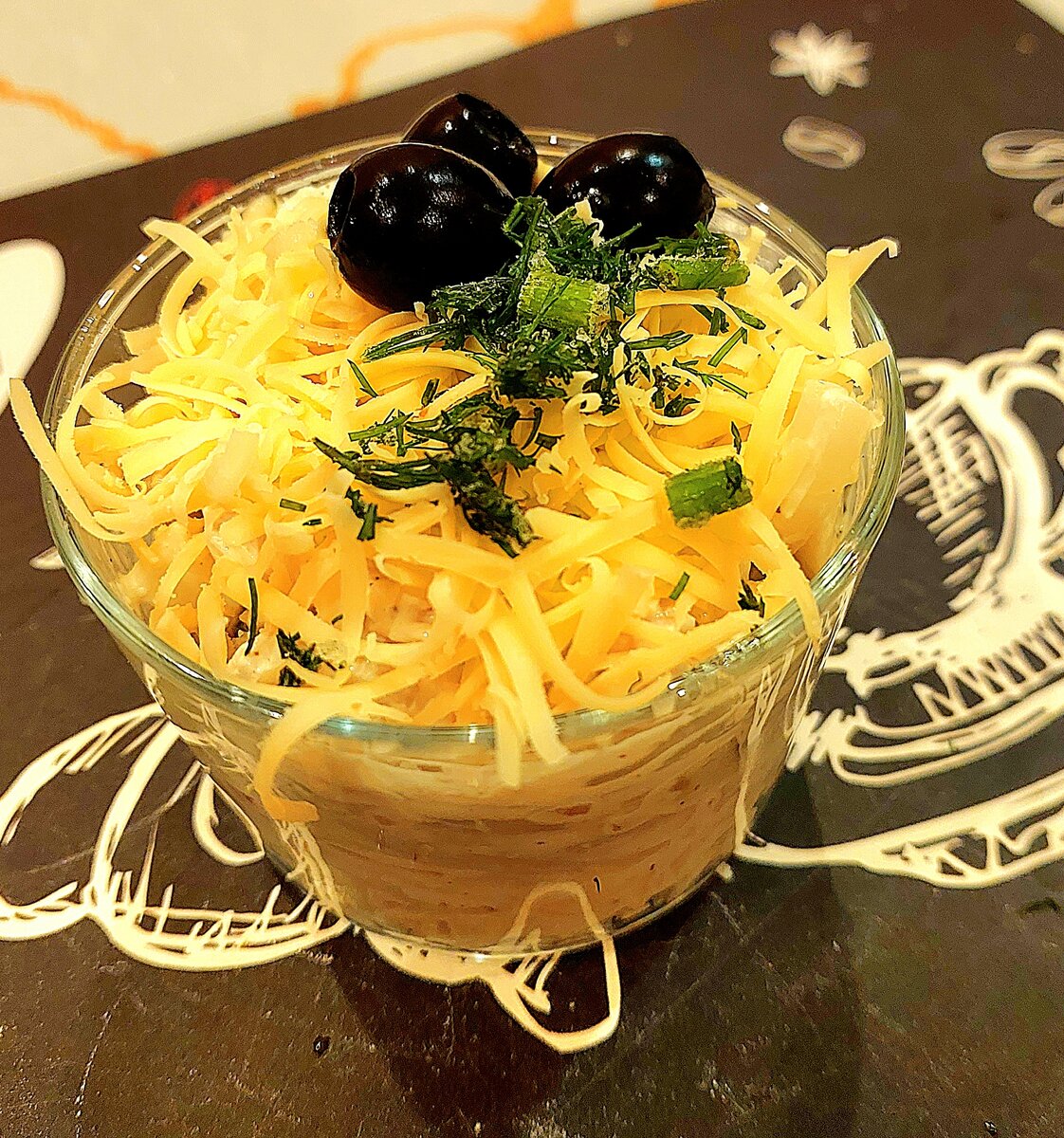 ■ Пятый слой завершающий - тертые желтки (желтки 4-х яиц),сыр и зелень, которые используют в качестве украшения.