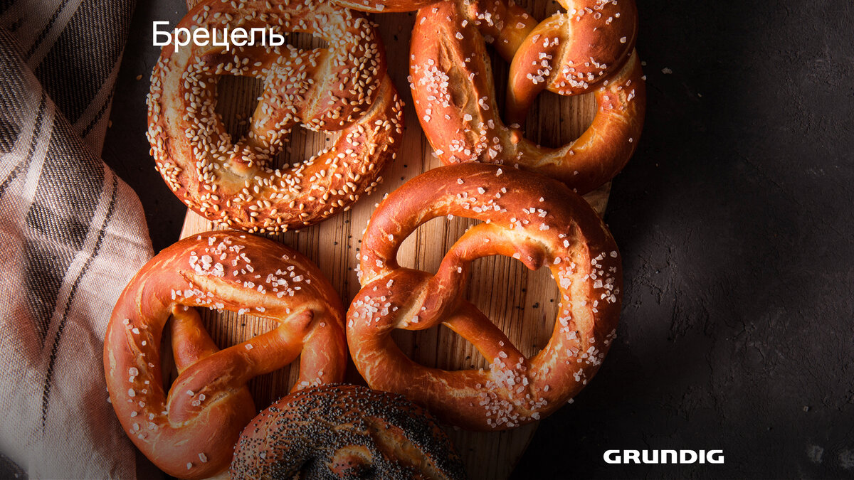 Аромат выпечки наполняет дом, а угощение, через которое три раза можно увидеть солнце, расцветает на столе. Сегодня мы приготовим брецели - невероятно аппетитную выпечку! В разных регионах Германии это кренделек называется по-разному, но нам он известен под названием «брецель». По нашему рецепту вы сможете их приготовить, даже если никогда не имели дело с тестом. Брецели прекрасно зарумянятся в духовом шкафу Grundig. 1. Смешать дрожжи с сахаром и 480 мл теплой воды, оставить на 5–10 минут, пока не появится пена. Затем добавить растопленное сливочное масло, 1 чайную ложку соли и муку, замесить плотное тесто. 2. Переложить тесто в смазанную растительным маслом чашу, накрыть пленкой и поставить в теплое место на 1 час. 3. Поднявшееся тесто разделить на двенадцать частей. Каждую часть раскатать в тонкую полоску длиной около 50 см. Поднять концы на столе, придав полоске форму подковы, затем перекрестить концы дважды и опустить их, соединив с нижней частью. Выложить заготовки на противень с