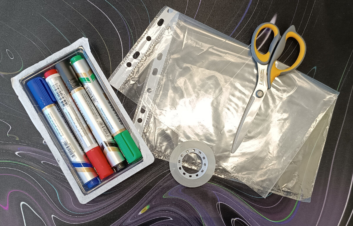 Итак, нам понадобятся тонкий скотч, цветные маркеры или фломастеры, ножницы либо канцелярский нож и, главный ингредиент — прозрачная плёнка.