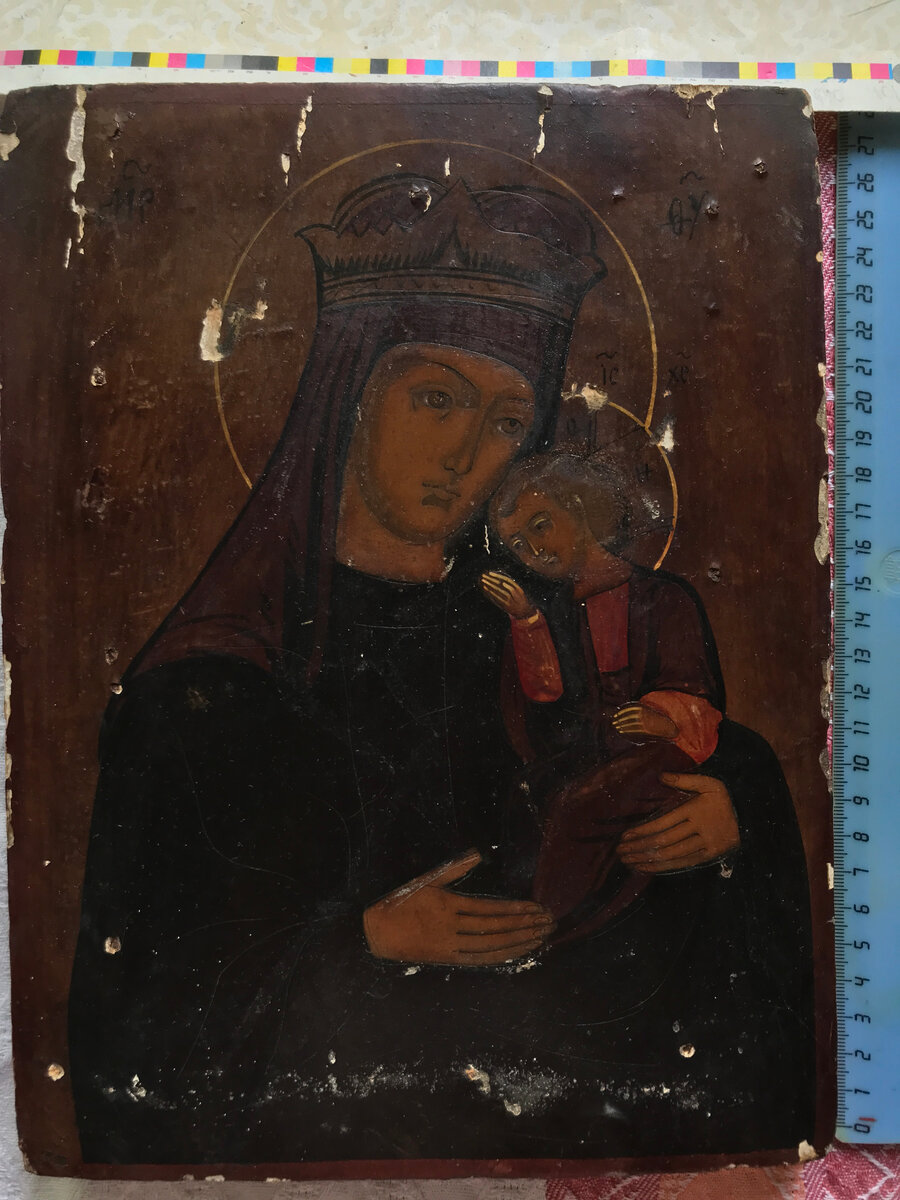 и сколько их таких, несложно написанных и нуждающихся в сложных спасательных операциях. Эта делалась под оклад - и оттого писана упрощённо, быстро, на глухом фоне с минимальной детализацией. При всём том, снова повторюсь - рука автора тверда, рисунок уверенный, композиция безусловно хороша. Головки - чудесные. Просто чудесные. Вот они после череды обработок - чистые, с красивой линией, несомненно небесные. А вот так выглядит вся икона целиком, когда удалены агрессивные грязи когда спасены проблемные места и заполнены лакуны. Остаётся заняться собственно живописной реставрацией - её немного, она очень сдержанная. В финале получается примерно это: И конца подобным работам нет. И как хорошо, что студенты - начинающие иконописцы могут близко видеть на моих занятиях такое качество рисунка, и не верить дурным утверждениям о намеренной уродливости иконы. *Спасибо, что смотрите. Все записи на тему собираются вот здесь.