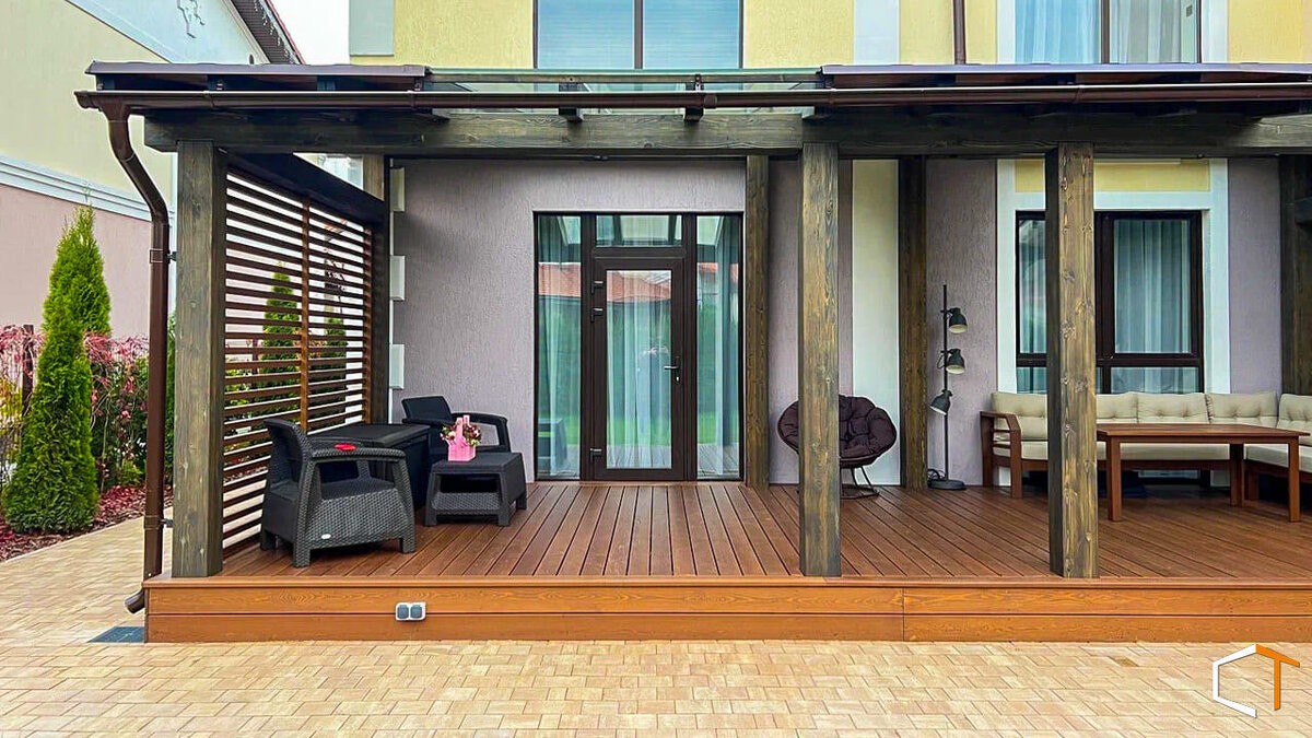 Как пристроить террасу с навесом к дому? Обзор террасы 50 м2 с перголой из видового клееного бруса