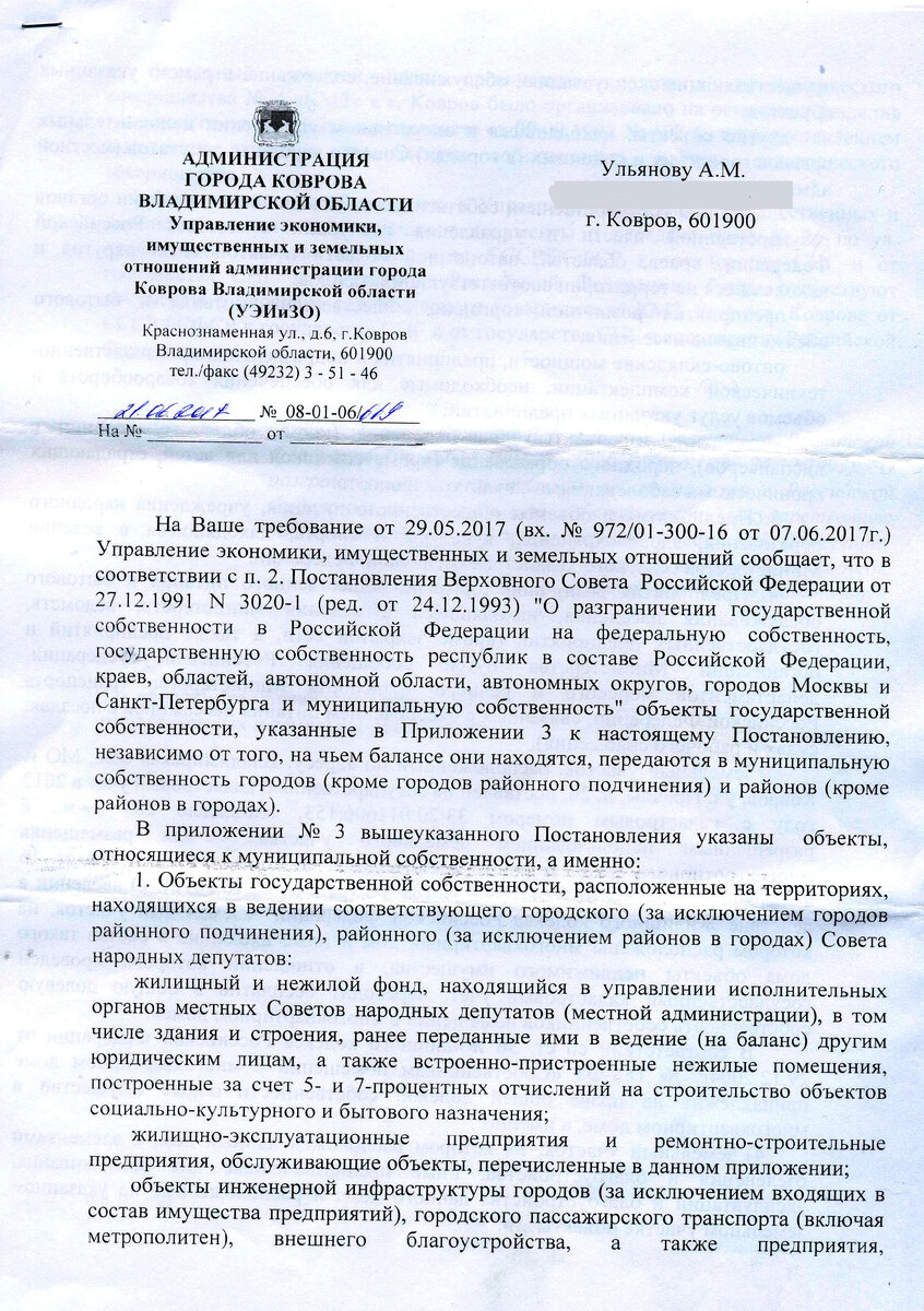 Первому заместителю главы администрации г. Коврова по ЖКХ, строительству и развитию инфра структуры Морозову Ю.А. От: Ульянова Александра Михайловича проживающего г. Ковров ул. ____________________ Требование Уважаемый Юрий Алексеевич, большое спасибо за Ваш оперативный ответ на мое обращение, но в ответе нет того, что я просил, мне предоставили совсем другую информацию, поэтому убедительно вас прошу, точно ответить на поставленные вопросы: 1) На балансе какого субъекта права находится дом, придомовая территория и земля, по адресу г. Ковров ул. Правды д. 26 , а именно - если дом был построен в дореволюционные годы, до 1917 года и находился на балансе СССР/РСФСР имеется ли документы передачи его на баланс от СССР/РСФСР к государству СНГ? От государства СНГ к государству Российская Федерация – Россия ? кто подписывал эти документы ФИО, должность, как с одной стороны так и с другой. Если такие документы имеются, прошу предоставить и ознакомить меня с ними. 2) На балансе какого субъекта