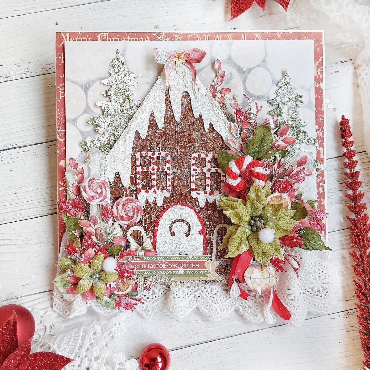 Для декора: вырубка (пряничный домик, елки, веточки с ягодками), вязаная конфета, высечки, кружево, лента, цветы и листья, белые помпошки, камешки и глиттер.
