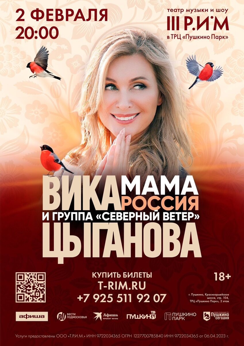 КОНЦЕРТ ВИКИ ЦЫГАНОВОЙ И ГРУППЫ «СЕВЕРНЫЙ ВЕТЕР» в ТЕАТРЕ МУЗЫКИ И ШОУ "lll РИМ". Московская область, город Пушкино, Красноармейское шоссе, стр. 104, ТРЦ «Пушкино Парк», 2 этаж