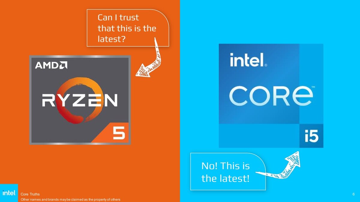 Похоже, формальное «перемирие» между Intel и AMD, длившееся несколько лет, вновь было нарушено: как сообщает ресурс VideoCardz, «синяя команда» решила «раскрыть глаза» рядовым пользователям, выпустив памятку с несколькими «истинами», которые, по мнению компании, должны пролить свет на некоторые «уловки» AMD. Прежде всего, в маркетинговом материале Intel отмечается, что «красная команда» использует не слишком прозрачную схему именования для своих процессоров, в результате чего в серии Ryzen 7000 присутствуют представители разных микроархитектур — примером послужил мобильный процессор Ryzen 5 7520U на базе Zen 2, которая впервые увидела свет в далёком 2019 году. Действительно, данная стратегия AMD далека от идеала, однако компания постаралась дать разъяснения касательно иерархии своих продуктов, добавляя в именования процессоров цифры, указывающие на их принадлежность к той или иной микроархитектуре: например, цифра «2» на третьей позиции имени модели показывает, что CPU является предста