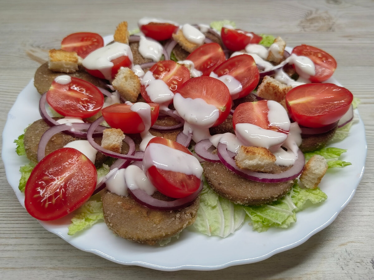Даже из самых дешевых продуктов можно приготовить шикарные закуски на праздничный стол! Ливерная колбаса. Колбасу нарезаем пятаками. В чашу разбиваем яйцо. Добавляем соль и чёрный перец. Взбиваем вилкой. Каждый кусочек макаем в яйцо, затем панируем в сухарях и обжариваем на растительном масле с двух сторон. Обжаренные кружочки выкладываем на салфетку или бумажное полотенце. Заправку нужно приготовить заранее, что бы она успела охладиться и настояться до сборки салата. В пиалу вливаем йогурт и добавляем чеснок. Вливаем яблочный уксус, добавляем соль и перец, можно добавить мёд разогретый в микроволновке. Взбиваем заправку венчиком и убираем в холодильник. На тарелку выкладываем предварительно порванные листья салата. За тем выкладываем ливерные биточки. Помидорки черри режем попалам. На биточки выкладываем кольца порезанного лука. Добавляем помидоры и сухарики. Салат поливаем охлаждённой заливкой и сразу же подаем на стол. ИНГРИДИЕНТЫ: Ливерная колбаса. Лук (красный) Помидоры