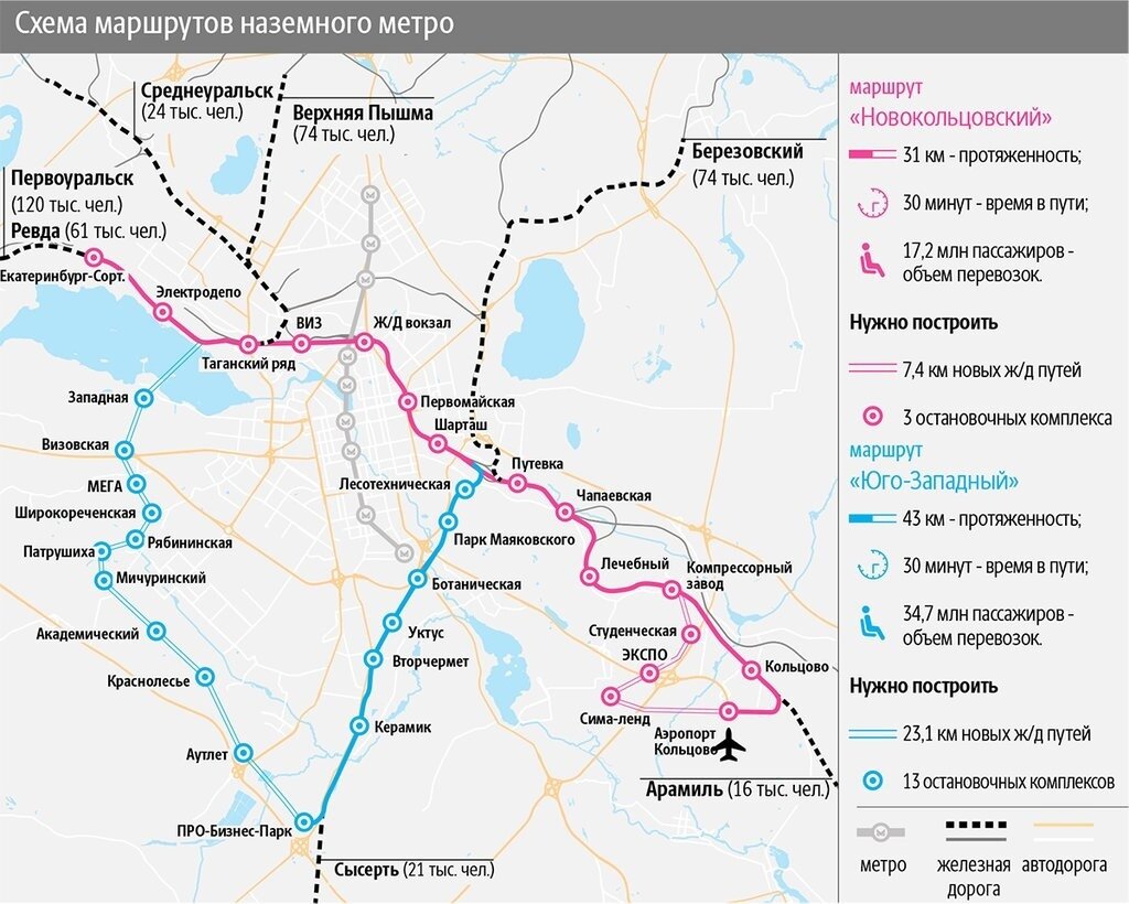 В 2022 году правительство Свердловской области, СвЖД и администрация уральской столицы приняли решение о запуске наземного метро - сети электричек вокруг Екатеринбурга. Соответствующее соглашение было подписано. Запланировано два маршрута для электротранспорта: «Новокольцовский» - от аэропорта Кольцово до районов Солнечный, Академический и Широкая речка, протяженностью 31 км, и «Юго-Западный» - через районы ВИЗ, Ботанический, Вторчермет и др., протяженностью 43 км. Железнодорожные ветки из городов-спутников, таких как Ревда, Первоуральск, Среднеуральск, Верхняя Пышма, Березовский, Сысерть и Арамиль, будут подведены к этим маршрутам. К 2030 году планируется полностью реализовать проект наземного метро в Екатеринбургской агломерации, который оценивается в 100 млрд рублей. Этот проект предусматривает создание общей транспортной магистрали, которая значительно увеличит пассажиропоток внутри Екатеринбурга с 233 млн до 300 млн поездок ежегодно, а также увеличит маятниковую миграцию до рекорд