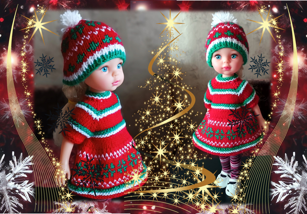 Сегодня у меня мастер-класс, в котором вы найдете пошаговое описание вязания по рядам нарядного новогоднего комплекта для кукол типа Paola Reina и других, подходящих по размеру.