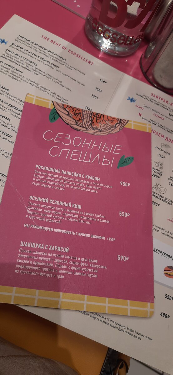 В эти выходные я посетила заведение с завтраками на Маяковской. В Eggesellent большинство блюд основано на яйцах, что можно понять из названия. Бронирования в ресторане нет, поэтому нужно ожидать столик в режиме «живой» очереди. В зимний период конечно не очень удобно, в связи с маленькой площадью кафе приходится ждать на улице, но девушки выносят пледы и чай мерзнущим в ожидании. У меня время ожидание заняло минут пятнадцать, с учетом того что я была первой в очереди. А вот за мной было уже около трех человек и люди все подходили. Внутри кафе все розовое, зал где расположены столики совсем маленький и расстояние между столиками около тридцать см. Для меня большой плюс, что в заведении на столах стоит питьевая вода. Из-за большого потока посетителей в кафе будет небольшое ожидание заказа. На завтрак мы выбрали: 1. Бенедикт с беконом (это тост с беконом, яйцом пашот и соусом голландез). К любому блюду можно выбрать доп.ингредиенты за отдельную плату. Поэтому к бенедикту с беконом мы реш